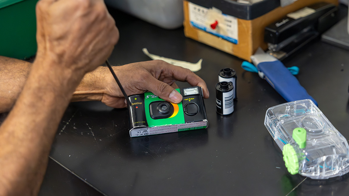 First, we make sure the camera is at zero otherwise, we advance it forward. This doesn’t happen often but it’s a safety step we like to take. Then we carefully break open the disposable camera at the perforated edge to extract the roll of film housed inside. This step is unique to disposable cameras, but once the roll is out, the rest of the process is just like developing any other film.